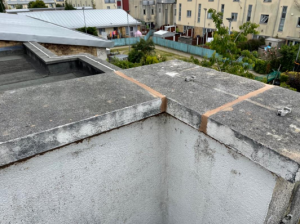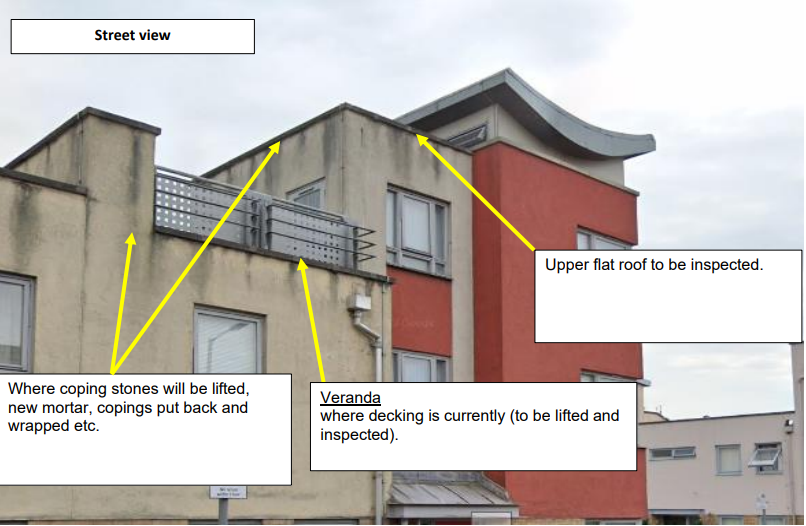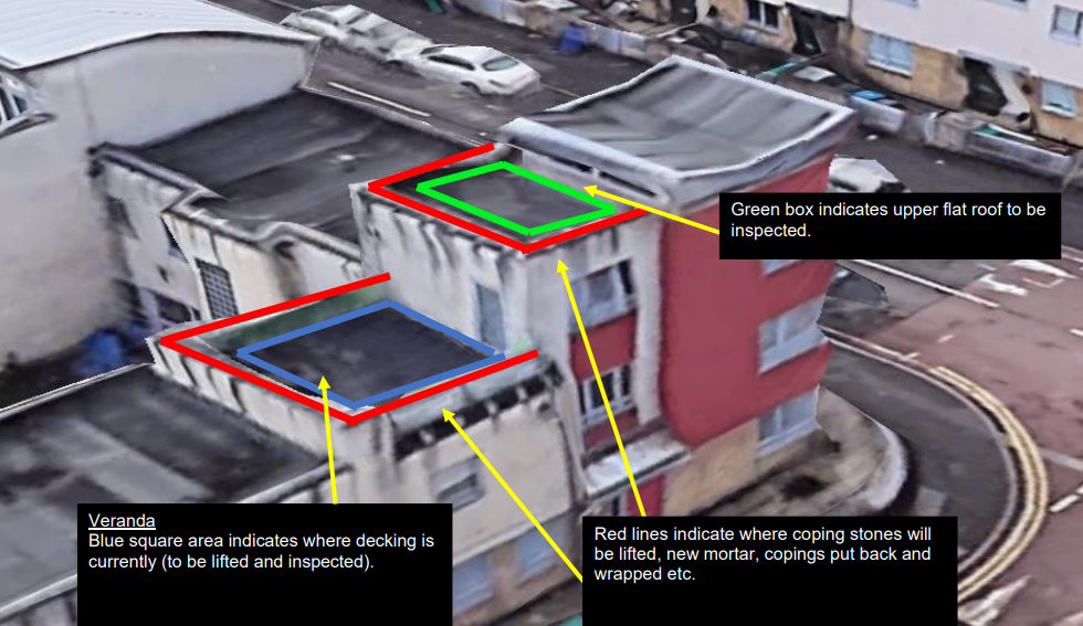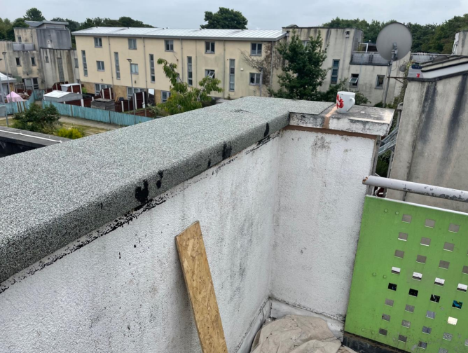 Here we had an issue of constant water penetration into the property in a number of areas a veranda, an upper flat roof, and coping stones all around… this meant we had to find a solution. – completed for a housing association.