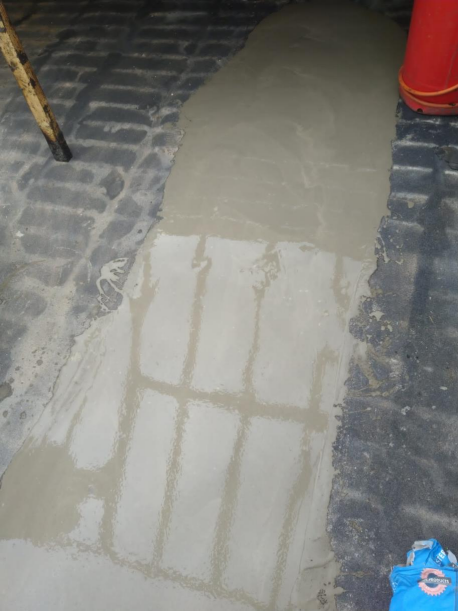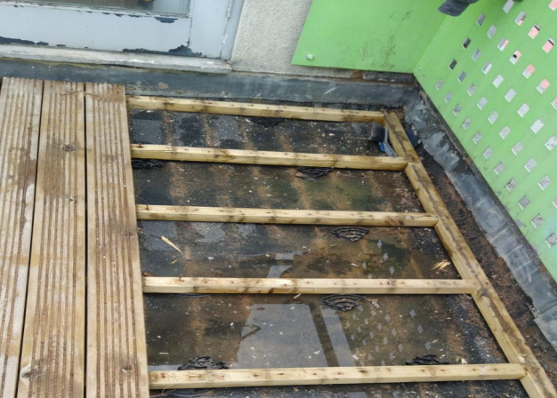 - Firstly, we lifted the decking and inspected it. We noticed the was not enough gradient on the veranda for the water to run to the drains/hoppers. We then applied a self-leveling screed with a slight gradient just enough for the water to run to the drains and not sit and seep through.