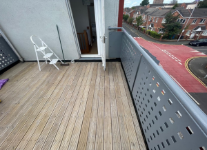 - Firstly, we lifted the decking and inspected it. We noticed the was not enough gradient on the veranda for the water to run to the drains/hoppers. We then applied a self-leveling screed with a slight gradient just enough for the water to run to the drains and not sit and seep through.